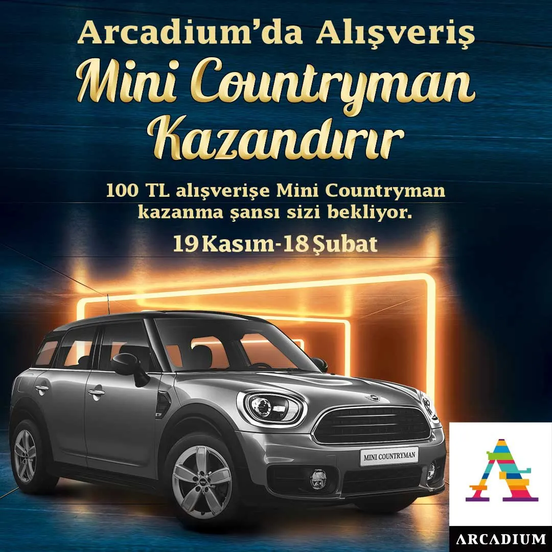 19 Kasım 2018 - 18 Şubat 2019 tarihleri arasında Arcadium AVM'de 100 TL alışverişe Mini Countryman kazanma şansı sizleri bekliyor.